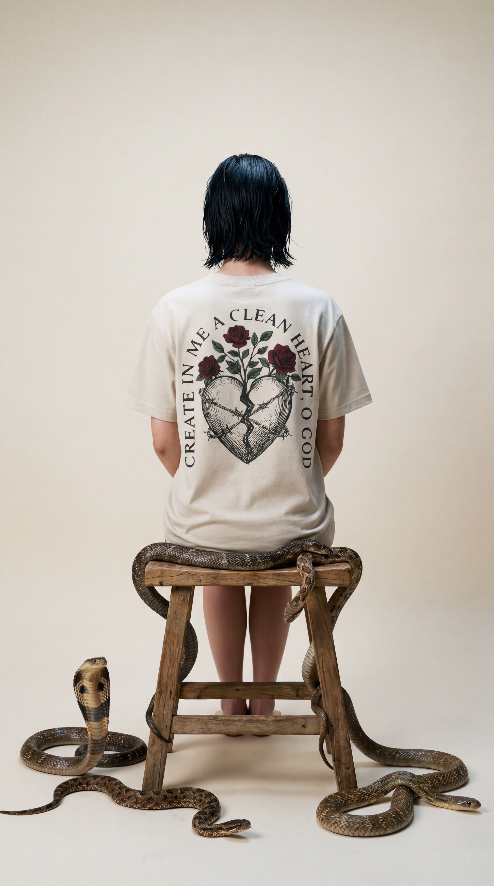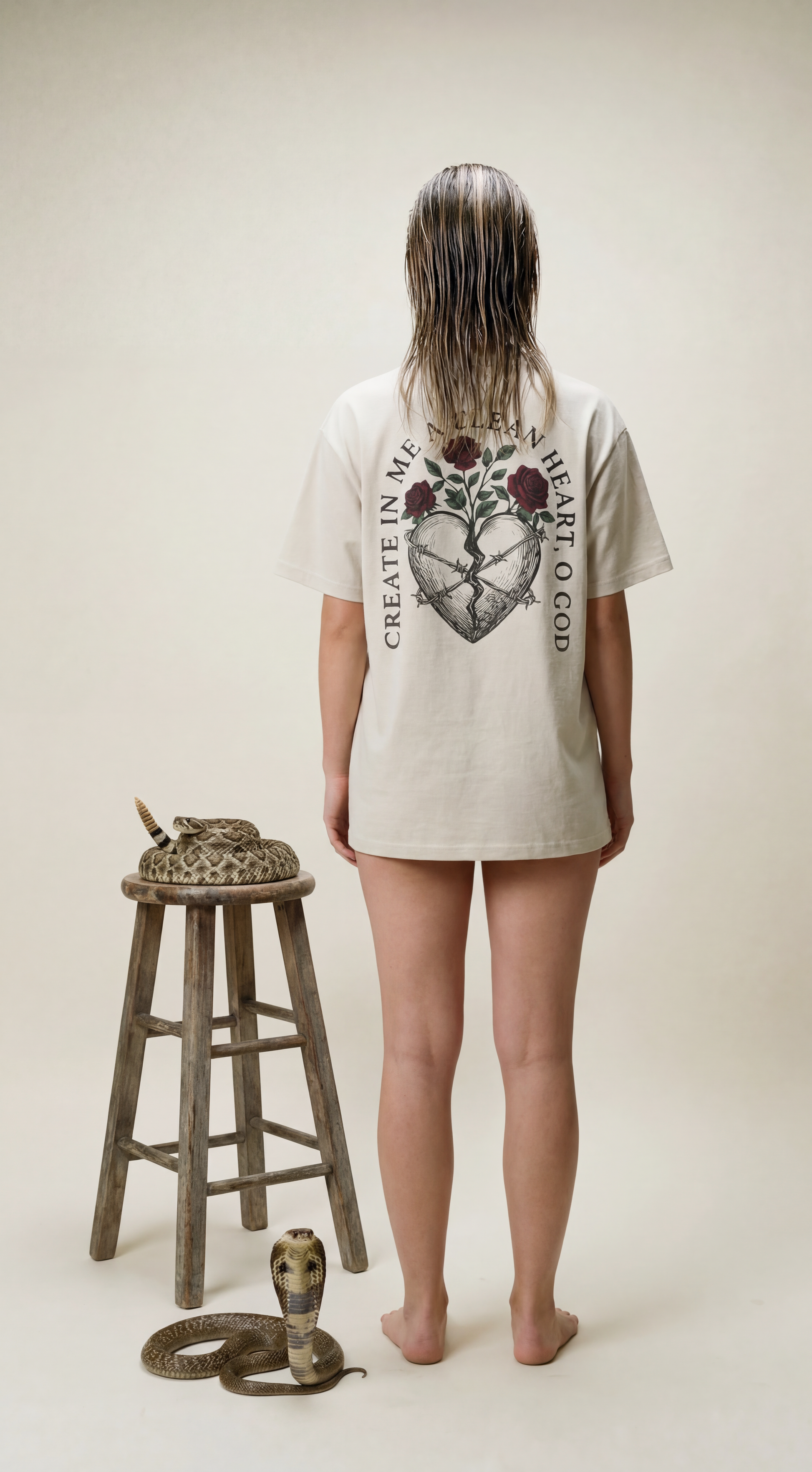 The Clean Heart Vessel is a heavyweight architectural tribute to the restorative power of God. Featuring the stark, minimalist cross on the chest and a sprawling, intricate back design of a broken heart blooming with roses, it serves as a wearable prayer from Psalm 51:10: