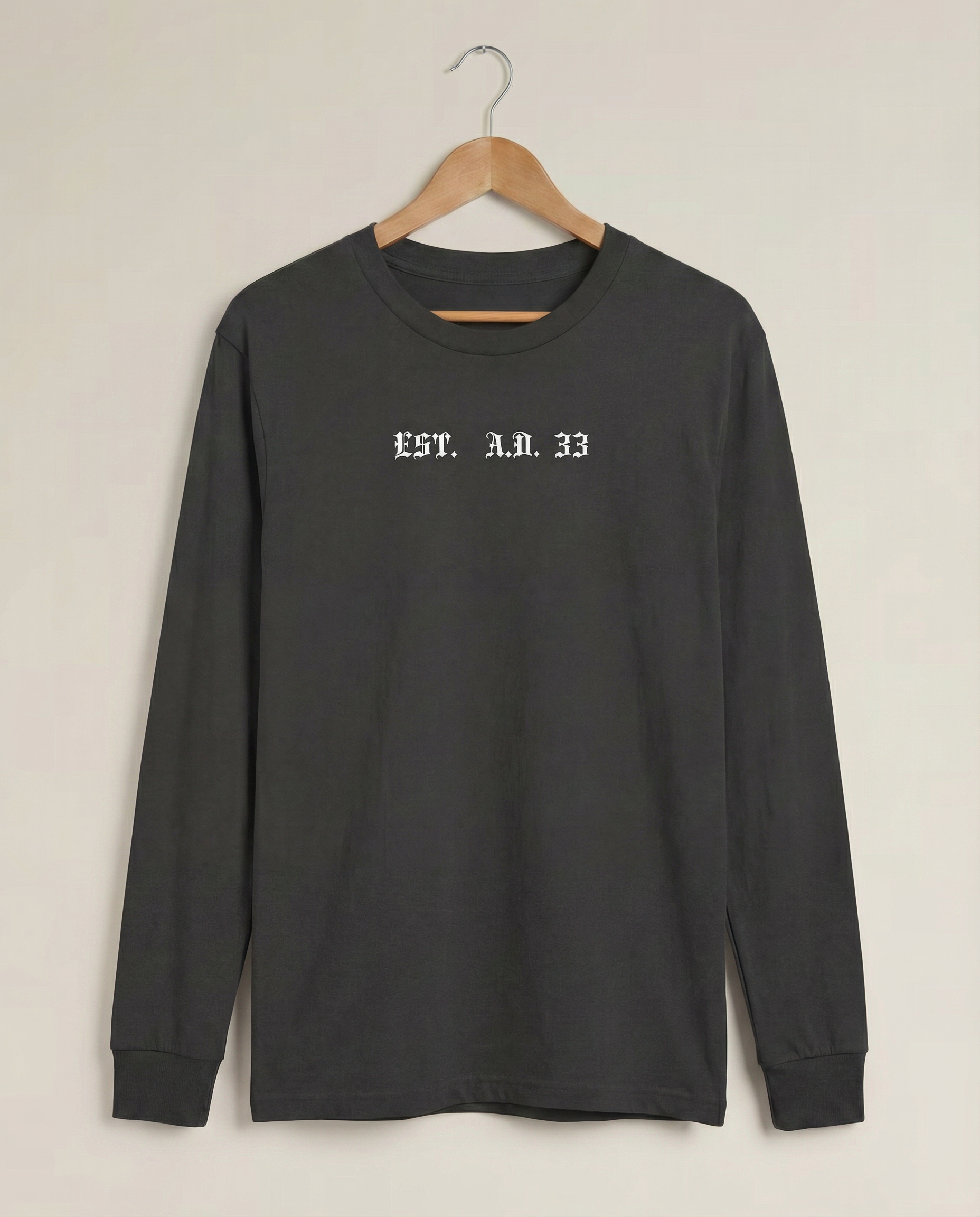 The A.D. 33 Long-Sleeve Vessel is a high-utility witness to the definitive moment in history. In this tactical Faded Black, the vessel carries the gravity of the sacrifice and the absolute power of the resurrection. Featuring a minimalist cross and "EST. A.D. 33" centered on the chest, the narrative is brought to its powerful conclusion on the back: the name "JESUS" arched over the number 33.